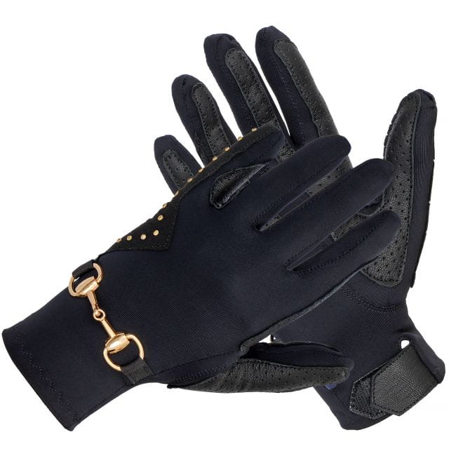 Eleganckie, bardzo elastyczne oraz wygodne rękawiczki wykonane z materiału lycra z naszyciami z miękkiej skóry naturalnej. Ozdobione metalowym wędzidłem oraz rzędem złotych cyrkonii na małym palcu.