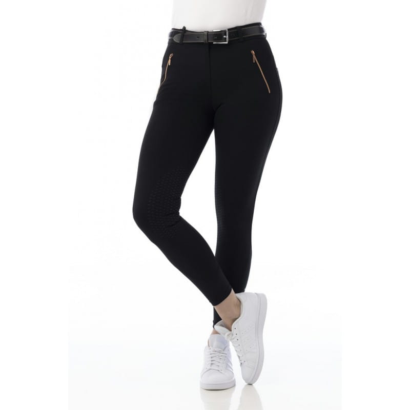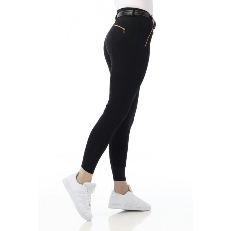 Czarne wytrzymałe bryczesy jeździeckie to połączenie stylu, funkcjonalności i wygody. Wykonane z lekkiego, szybkoschnącego materiału (90% poliester, 10% elastan), zapewniają doskonałą oddychalność oraz rozciągliwość, gwarantując pełną swobodę ruchów podczas jazdy. Klasyczny fason z zachodnimi kieszeniami, ozdobionymi błyszczącymi ćwiekami na kontrastowej zamszowej lamówce, nadaje im elegancji. Silikonowe łaty na kolanach zapewniają optymalną przyczepność, a dolna nogawka z elastanu gwarantuje idealne dopasowanie. Można je prać w pralce w temperaturze 30°C, co czyni je praktycznym wyborem na każdą okazję.