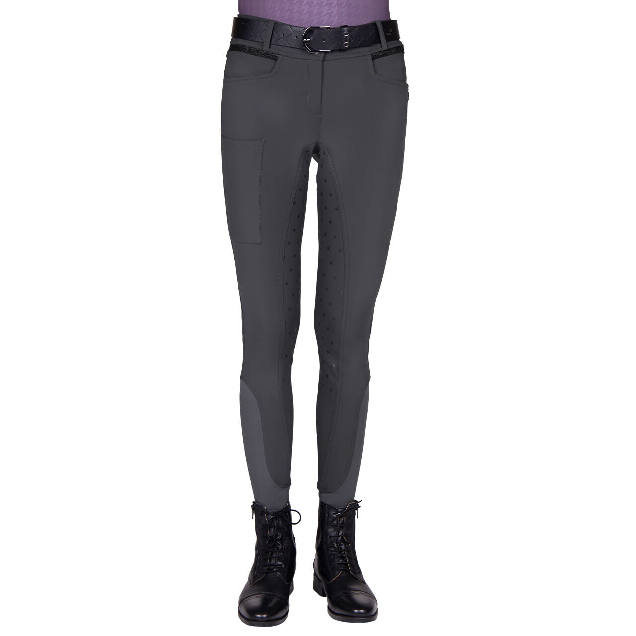 Bryczesy jeździeckie to wszechstronny wybór na każdą porę roku, łączący funkcjonalność z elegancją. Wykonane z wysokiej jakości materiałów – przód z 77% poliamidu i 23% elastanu, tył z 90% poliestru i 10% elastanu – zapewniają doskonałą rozciągliwość i komfort noszenia. Ozdobny silikonowy wzór z pełnym gripem gwarantuje świetną przyczepność na siodle, a brokatowe wykończenia na tylnych kieszeniach nadają bryczesom szykowny wygląd. Praktyczna kieszeń na telefon, umieszczona w górnej części prawej nogawki, sprawia, że bryczesy są nie tylko stylowe, ale i funkcjonalne. Idealne zarówno na treningi, jak i zawody.