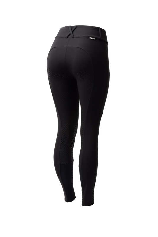 Boczne kieszenie na udach umożliwiają wygodne przechowywanie telefonu lub innych drobnych akcesoriów. Zamek błyskawiczny oraz szlufki na pasek podkreślają funkcjonalny, schludny wygląd legginsów. Cienkie wstawki z lycry w nogawkach, dopasowane kolorystycznie do głównego materiału, w połączeniu z bardzo elastycznymi zakończeniami nogawek, zapewniają idealne dopasowanie do butów jeździeckich bez ucisku.