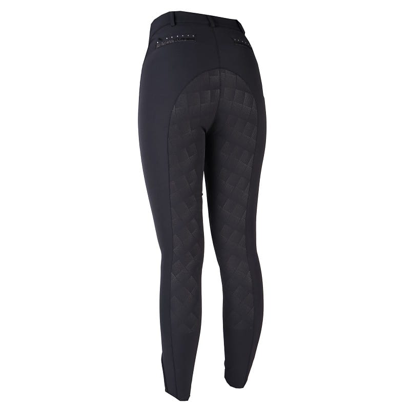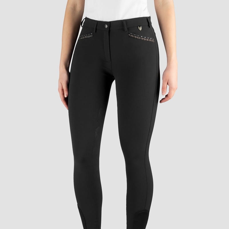 Damskie bryczesy Horka Alexa w kolorze czarnym to idealne połączenie wygody i elegancji. Wykonane z wysokiej jakości mikropoliestru (90%) i lycry (10%), zapewniają doskonałe dopasowanie i komfort. Średnio wysoki stan oraz pochlebny krój podkreślają sylwetkę, a brokatowa taśma i kryształowe detale dodają wyrafinowanego stylu. Matowe silikonowe pełne siedzisko gwarantuje pewny chwyt w siodle. Praktyczne kieszenie zapinane na zamek pomieszczą telefon komórkowy, a sztuczne kieszenie z tyłu uzupełniają design. Dostępne w rozmiarach 128–46.
