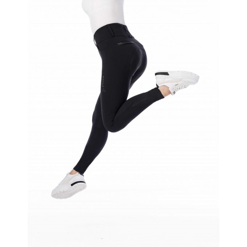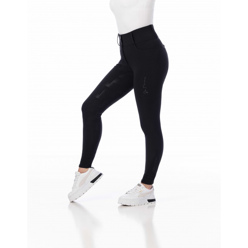 Elastyczna tkanina dopasowuje się do sylwetki, nie ograniczając ruchów w siodle. Wysoki pas stabilizuje bryczesy w trakcie jazdy i zapewnia odpowiednie podtrzymanie. Dodatkowo silikonowy pełny lej poprawia przyczepność do siodła, zwiększając poczucie kontroli i bezpieczeństwa. Ozdobne detale z cyrkoniami oraz subtelne logo „Je t’aime” na udzie nadają całości eleganckiego, młodzieżowego charakteru.