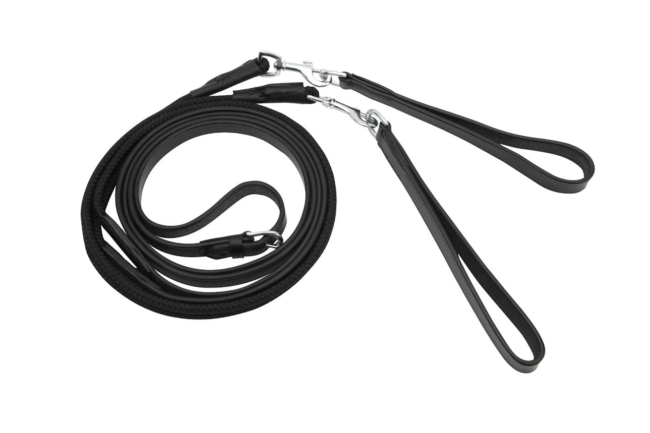 Czarna wodza w wersji DELUXE, wykonana ze skóry z dwoma mocowaniami do popręgu. Mocowanie popręgu można zdjąć za pomocą karabińczyka.