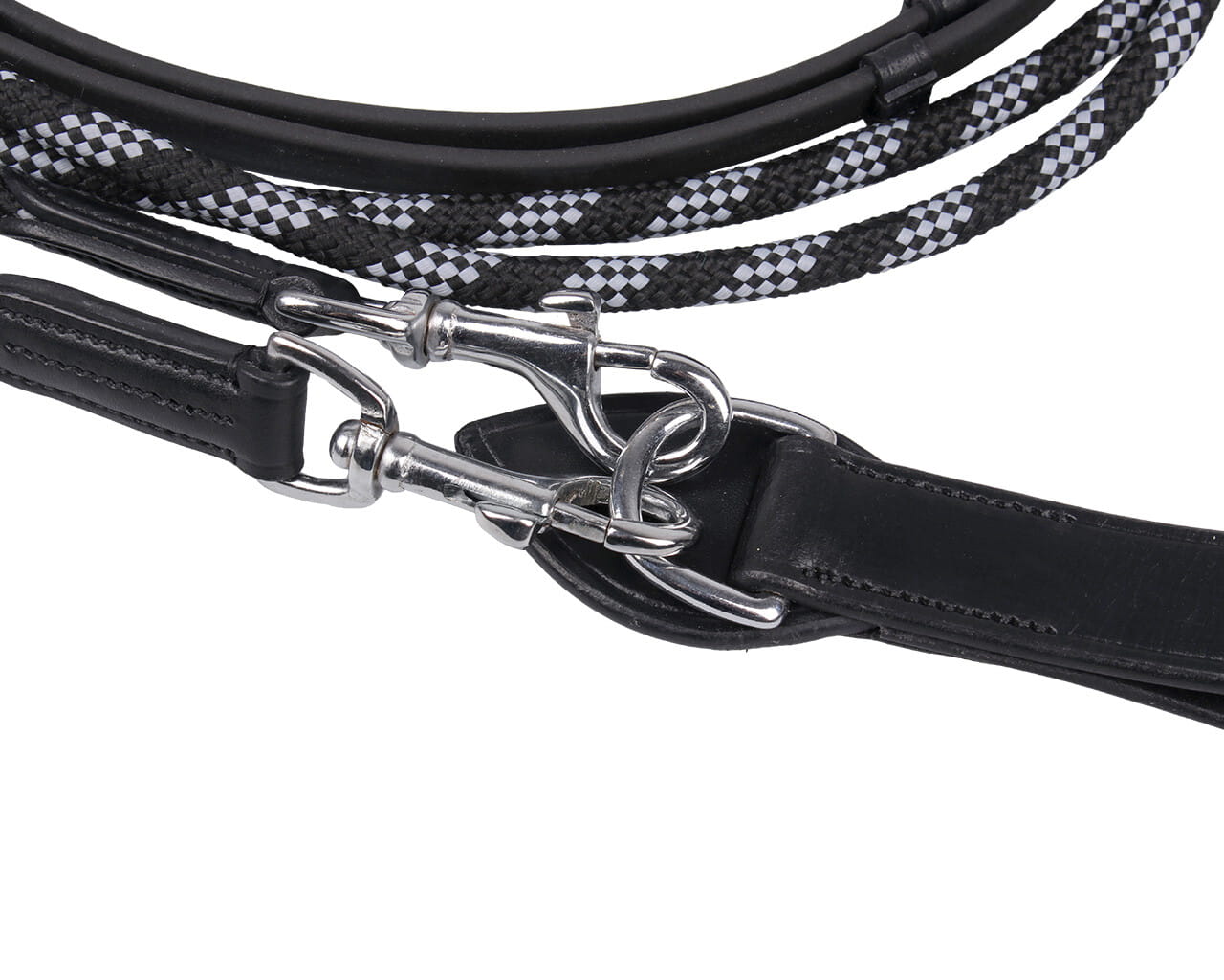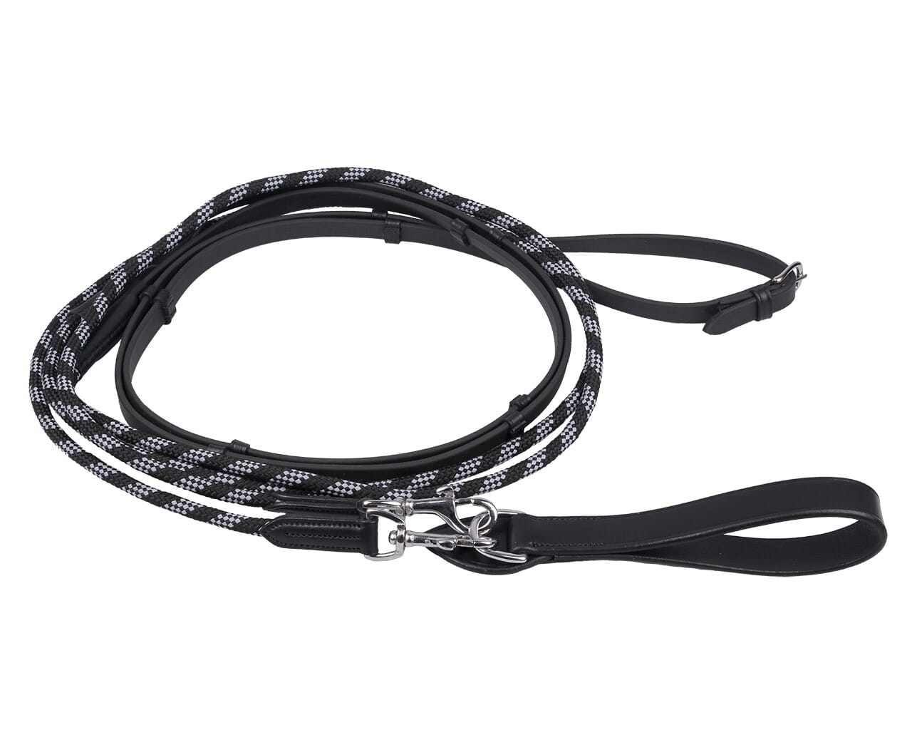 Wodza pomocnicza QHP wykonana z trwałego biotanu i dwukolorowego sznura. Biotan to elastyczny i przyjazny dla dłoni materiał, idealny do codziennych treningów. Wyposażona w stopery oraz skórzaną pętlę z kółkiem do łatwego podpięcia.