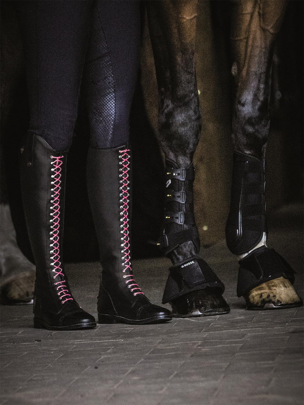 • sznurowane na całej długości, dzięki czemu można optymalnie dopasować je do obwodu łydki, pod sznurowaniem stabilnie zamocowany skórzany język