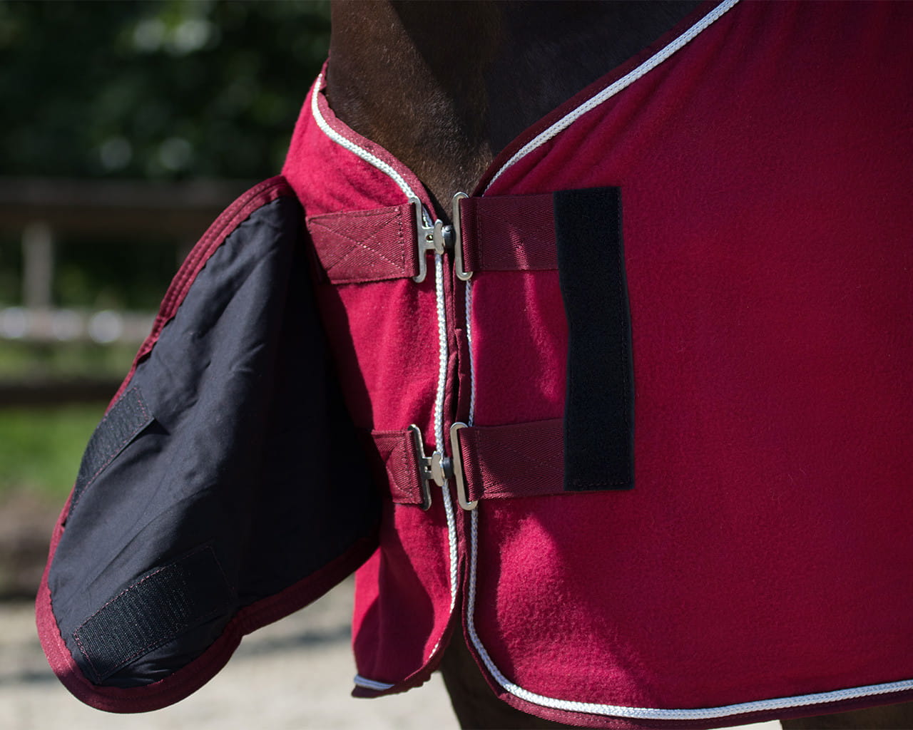 Derka polarowa QHP Ornament w kolorze bordowym to doskonałe połączenie stylu i funkcjonalności. Wykonana z wysokiej jakości polaru, skutecznie osusza konia po treningu i zapewnia mu komfort cieplny. Materiał jest wytrzymały, nie mechaci się i nie traci koloru, co gwarantuje długotrwałe użytkowanie. Derka wyposażona jest w pasy krzyżowe pod brzuchem oraz zapięcie na klatce piersiowej z dodatkową klapą na rzep, dzięki czemu dobrze leży na koniu. Całość zdobią eleganckie detale – pleciona koniczyna na zadzie i dekoracyjne sznureczki na lamówce.