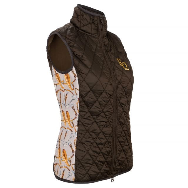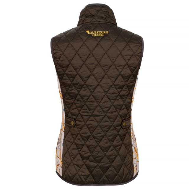 Elegancka kamizelka wykonana z błyszczącego materiału. Ozdobiona nadrukowanym motywem jeździeckim oraz dwoma haftami. Idealny dodatek do Twoich stylizacji.