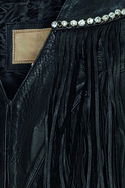 Kamizelka z frędzlami, wykonana z miękkiej skóry bydlęcej, misternie wykończona, z osadzonymi kryształkami. Zapinana na haczyk.