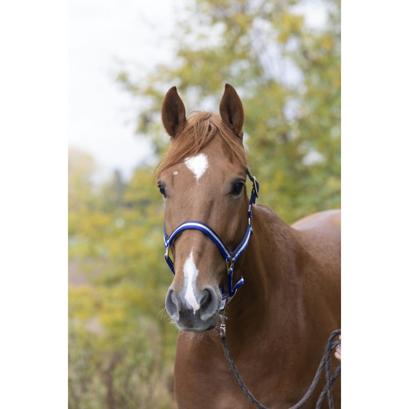 Potrójnie składany nylonowy kantar na głowę z czarną wyściółką. Regulowany nachrapnik i nakrycie głowy. Klamry w kolorze złotym.