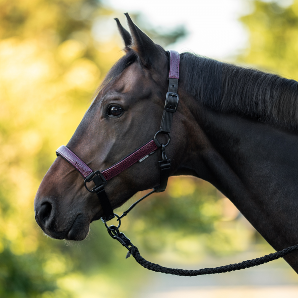 Dwuwarstwowy materiał Klamry po obu stronach do regulacji Obwód nosa można regulować po prawej stronie Pasek na gardło z solidnym karabińczykiem Z okuciami cynkowymi lakierowanymi na czarno Materiał paska: polipropylen Aplikacje o wyglądzie skóry krokodyla: poliester z powłoką poliuretanową