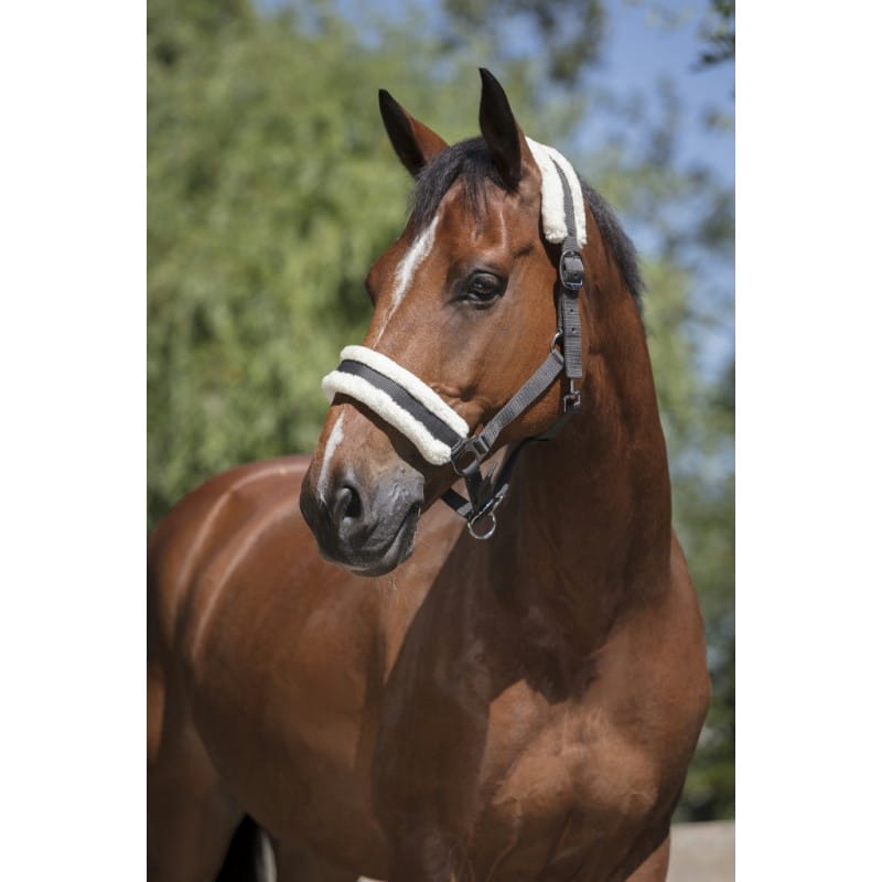 Z polipropylenu o podwójnej grubości, podszyty beżową syntetyczną owczą skórą, z regulowanym paskiem na potylicy i nachrapniku. Metalowe sprzączki.