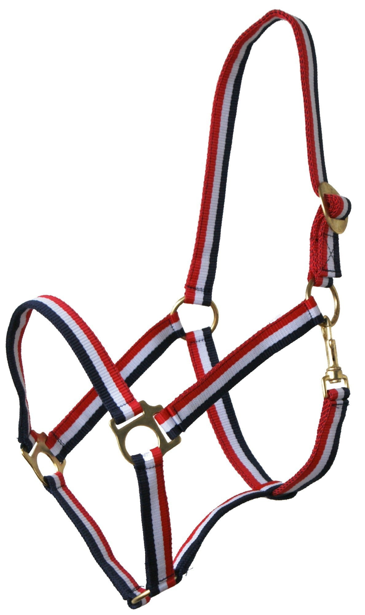 Wysokiej jakości kantar wykonany z wytrzymałej, syntetycznej taśmy polipropylenowej. Kantar wyróżnia się trójkolorowym wzorem w paski w kolorach czerwonym, białym i niebieskim, który nadaje mu nowoczesny i stylowy wygląd.