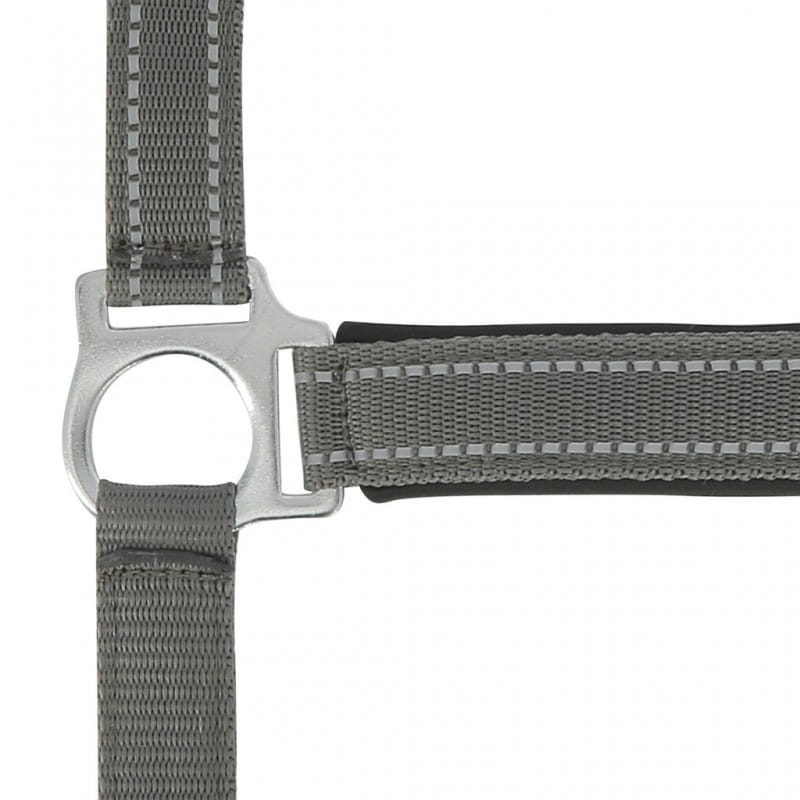 Kantar z polipropylenu o podwójnej grubości, podszyty neoprenem, ozdobiony odblaskową przędzą. Metalowe sprzączki.