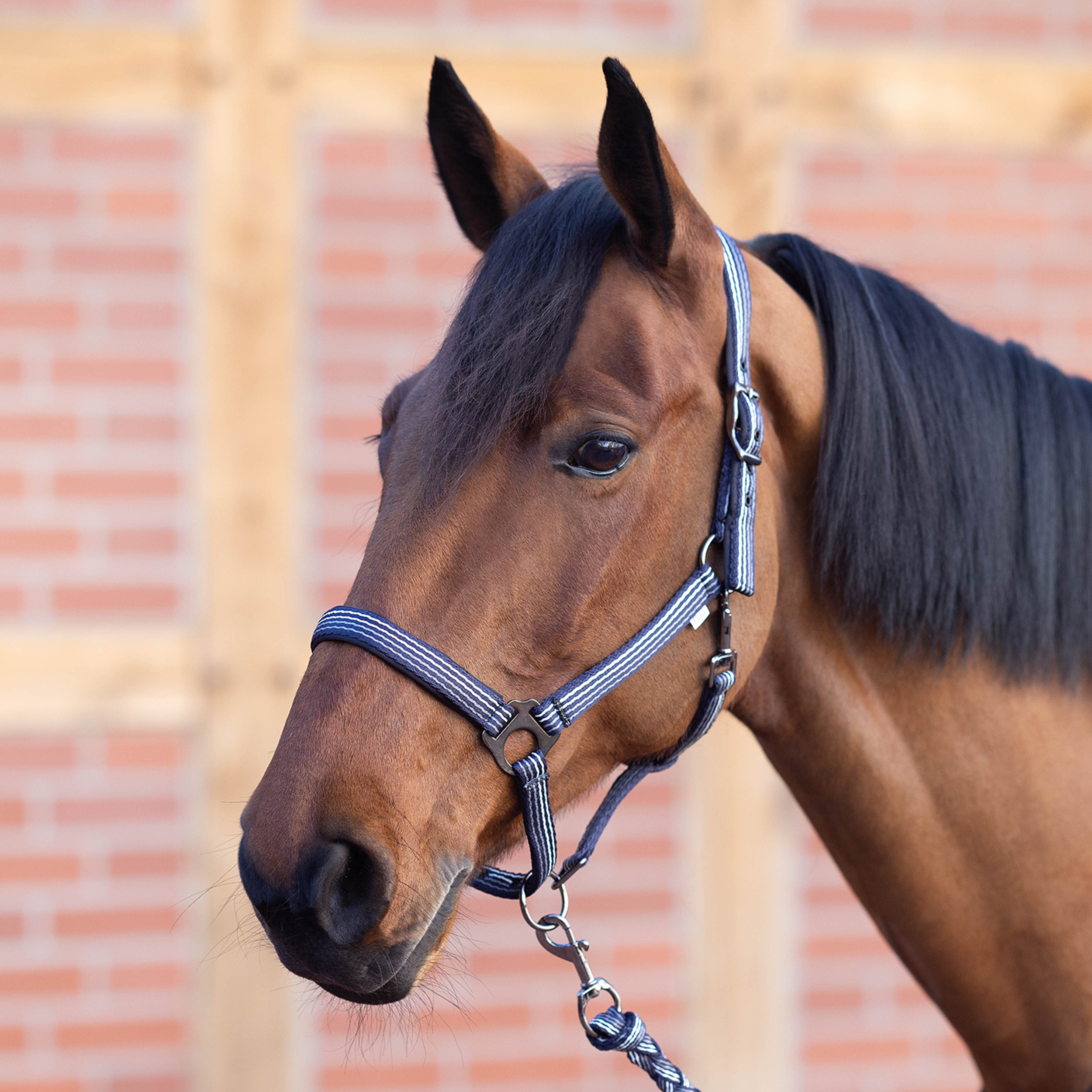 -pasek nosowy regulowany z prawej strony dla ułatwienia prowadzenia konia na uwiązie (z lewej strony)