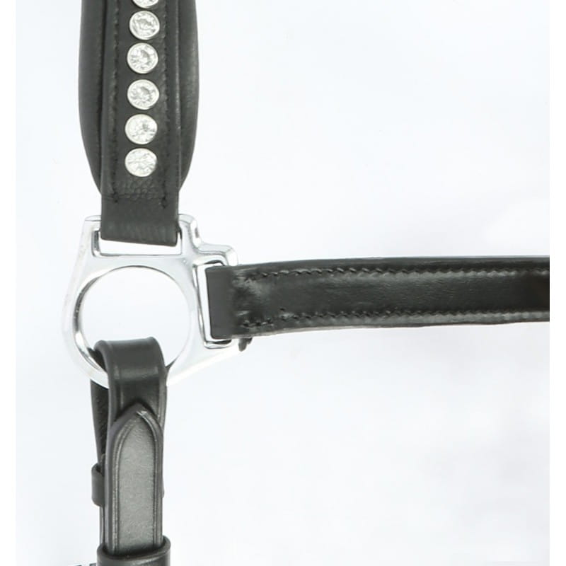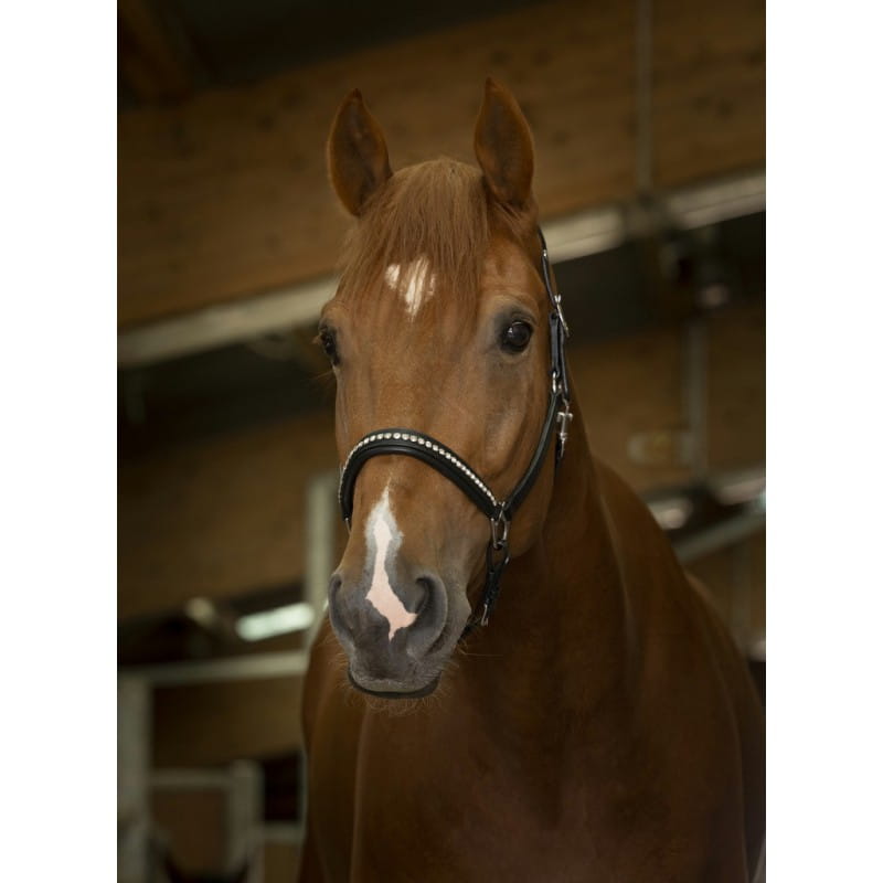 Kantar ze skóry bawolej, z podwójną regulacją anatomicznego nagłówka, wyściełany skórą bydlęcą. Regulowany nachrapnik z 3 karabińczykami, ozdobiony przezroczystymi kryształkami i podszyty skórą bydlęcą. Czarne szwy dla czarnej skóry i białe szwy dla brązowej skóry. Klamry ze stali nierdzewnej.