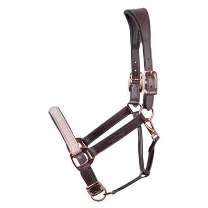 Luksusowy skórzany kantar z anatomicznym nakryciem głowy i zapięciami w kolorze różowego złota. Podwójnie regulowany nakrycie głowy i regulowany na nosie. Bardzo elastyczny i wygodny, miękko wyściełany.