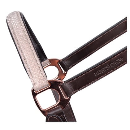Luksusowy skórzany kantar z anatomicznym nakryciem głowy i zapięciami w kolorze różowego złota. Podwójnie regulowany nakrycie głowy i regulowany na nosie. Bardzo elastyczny i wygodny, miękko wyściełany.