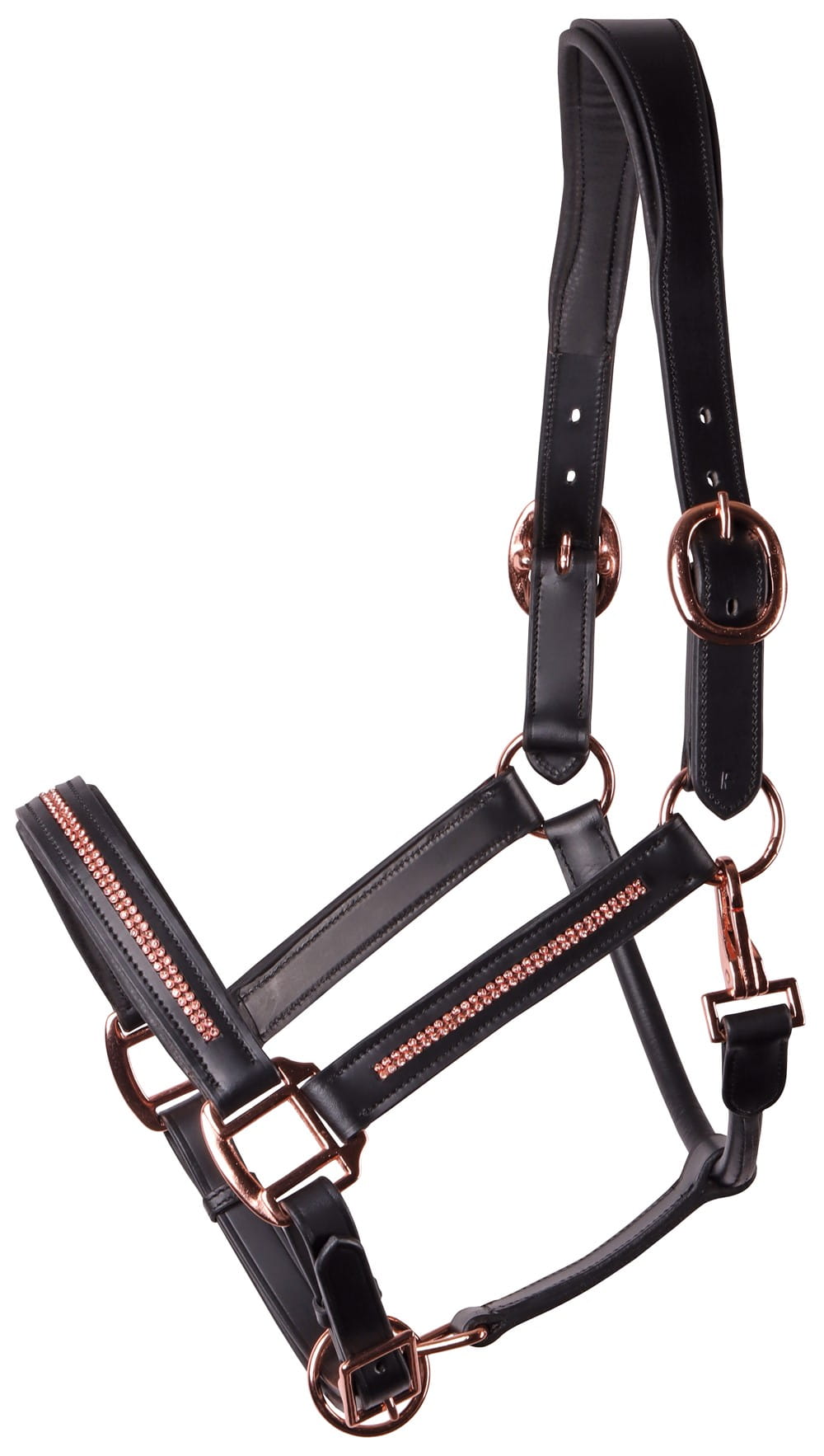 Luksusowy skórzany kantar zdobiony kryształkami na nachrapniku i policzkach. Bardzo miękkie i elastyczne wypełnienie oraz regulacja po obu stronach nakrycia głowy.