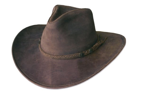 Kapelusz westernowy ze skóry nubukowej z plecioną opaską.