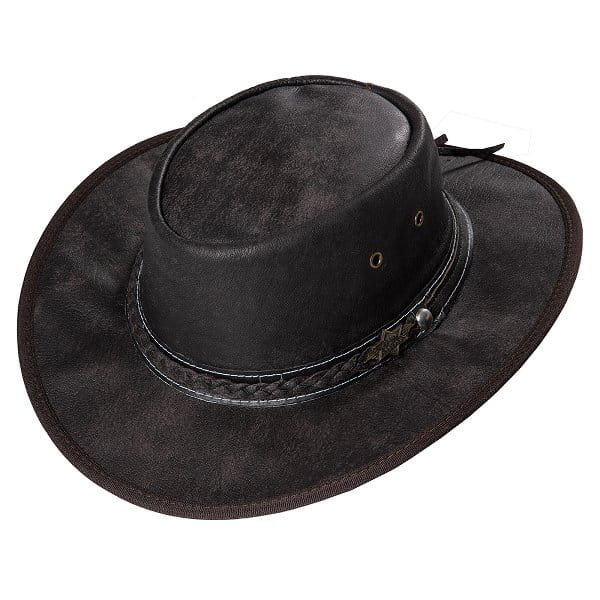 Zgniatana czapka ze skóry bawoła westernowego. Misterna opaska na kapelusz składa się z ciemnego skórzanego paska ze skórzanym oplotem, który kończy się nitem z każdej strony i pięknym koncho z tyłu. Przyjemny komfort noszenia dzięki elastycznemu paskowi wewnętrznemu. Z regulowanym skórzanym krawatem.