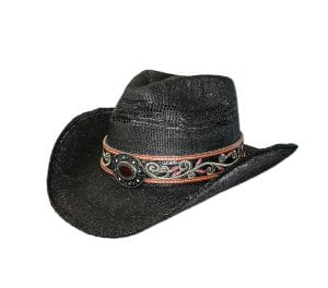 Zachowujący kształt zachodni kapelusz słomkowy z ozdobną skórzaną opaską z zachodnim garbem, kwiatowymi haftami i małymi ćwiekami. Wygodne dopasowanie dzięki miękkiemu paskowi wewnętrznemu.