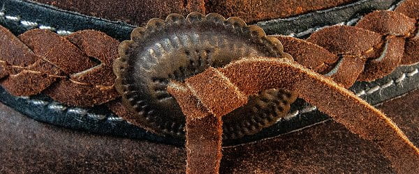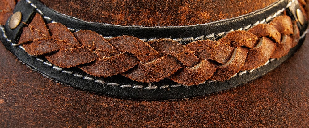 Fajny westernowy kapelusz wykonany z woskowanej, czerwono-brązowej dwoiny. Wyrafinowana opaska na kapelusz składa się z ciemnego skórzanego paska z dołączonym skórzanym oplotem, który jest zaokrąglony wokół nitami i dopasowanym concho z tyłu. Przyjemny komfort noszenia dzięki miękkiemu paskowi wewnętrznemu. Z regulowanym skórzanym krawatem.
