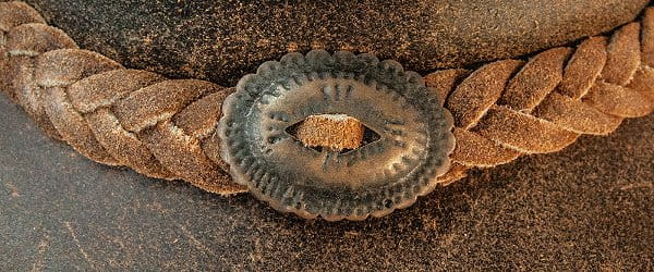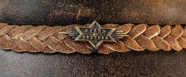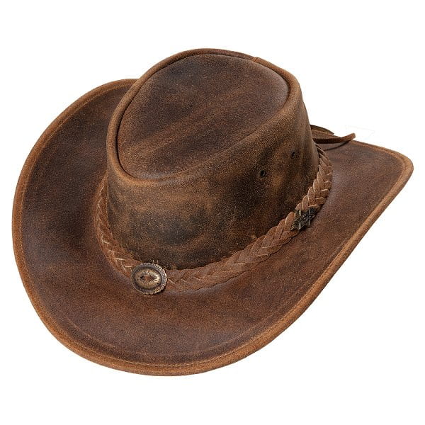 Fajny westernowy kapelusz wykonany z woskowanej, brązowej skóry dwoinowej. Opaska na kapelusz składa się z plecionych skórzanych pasków, które zostały zaokrąglone dopasowanym concho z przodu iz tyłu. Przyjemny komfort noszenia dzięki miękkiemu paskowi wewnętrznemu. Z regulowanym wiązaniem ze skóry.