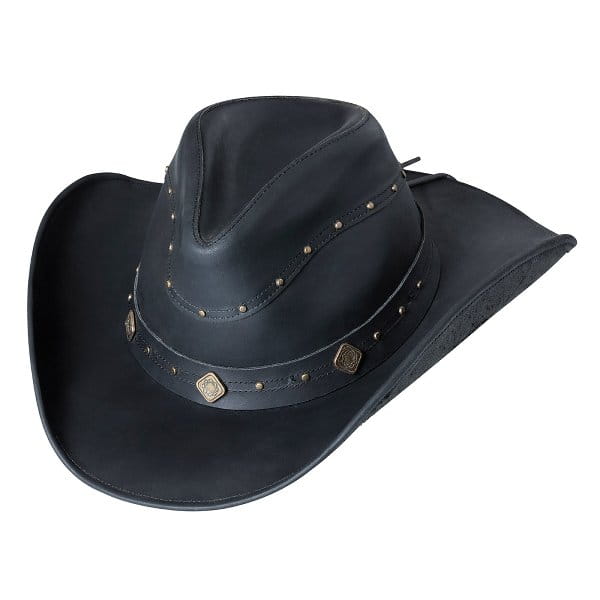Fajna, nadająca się do kształtowania czapka westernowa ze skóry bydlęcej ozdobiona konchami i ćwiekami oraz miękkim paskiem wewnętrznym.