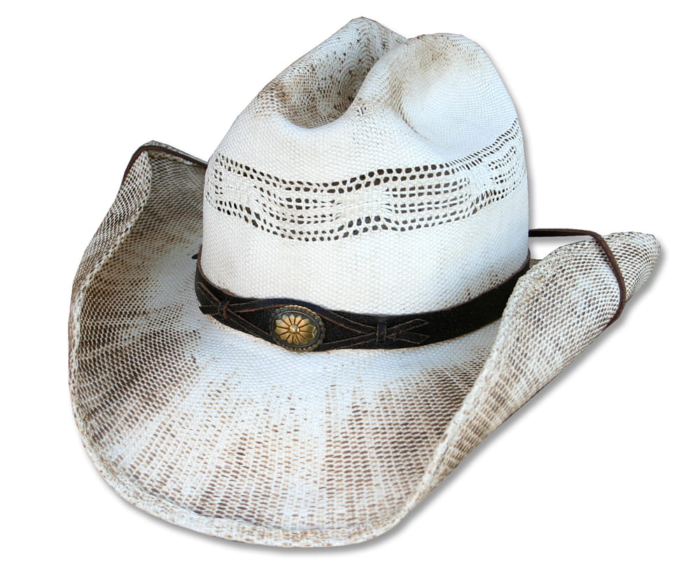 Słomkowy kapelusz westernowy z daszkiem do samodzielnego dopasowania, skórzanym paskiem z koncho i regulowanym skórzanym wiązaniem.