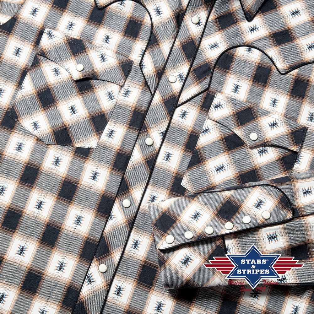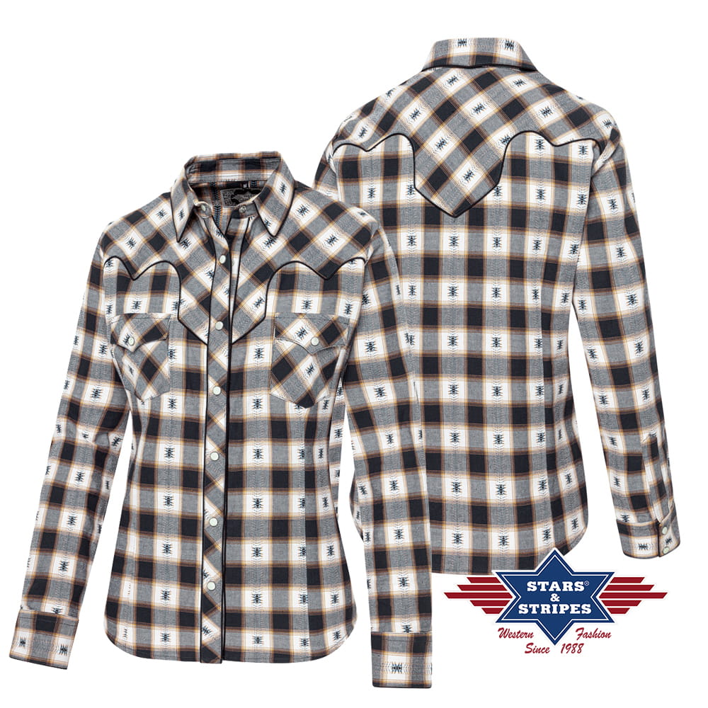 Koszula w stylu western wyróżnia się odważnym wzorem w kratę w stonowanych odcieniach, z małymi, tkanymi detalami. Typowe zachodnie jarzmo, naszywane kieszenie na piersi i marmurkowe napy nadają autentyczny urok kowbojki. Uniwersalna bluzka, która idealnie nadaje się do swobodnych, ale stylowych strojów.
