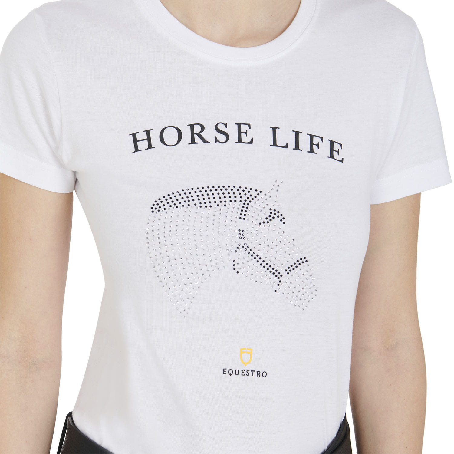 Damska bawełniana koszulka slim fit z krótkimi rękawami, idealna na sezon letni, ponieważ jest oddychająca. Gwarantuje całkowitą swobodę ruchów i optymalny komfort. Ubranie ma być wyrafinowane i eleganckie i jest ozdobione kompozycją z kryształków, napisem „horse life” i logo Equestro.
