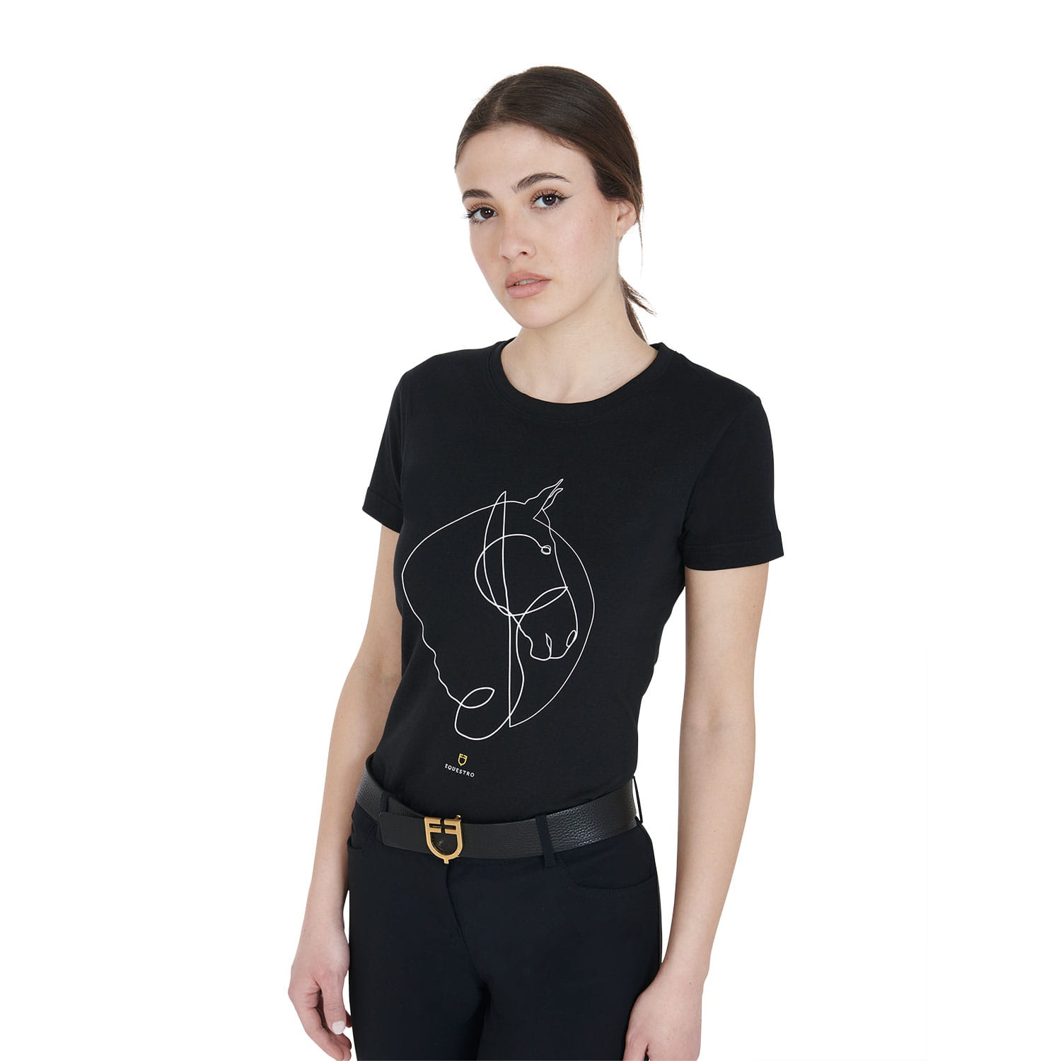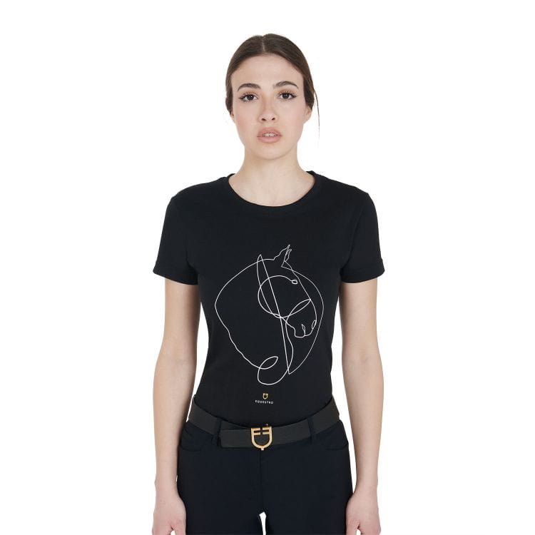 Bawełniana koszulka damska slim fit z półrękawami, doskonała na sezon letni, ponieważ jest przewiewna, elastyczna i świeża. Gwarantuje doskonałe dopasowanie, maksymalną swobodę ruchów i wyjątkowy komfort. T-shirt zdobi nadruk stylizowanego wizerunku konia.