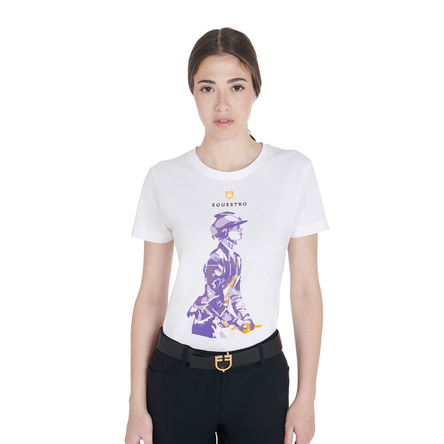 Damska koszulka z krótkim rękawem o dopasowanym kroju, wykonana z miękkiej bawełny, aby zapewnić maksymalną swobodę ruchów i wyjątkowy komfort. Wydajna odzież , która ułatwia również odparowywanie i rozpraszanie potu. Ma minimalną elegancję, ozdobioną kolorowym nadrukiem i logo Equestro z napisem nadrukowanym na piersi.