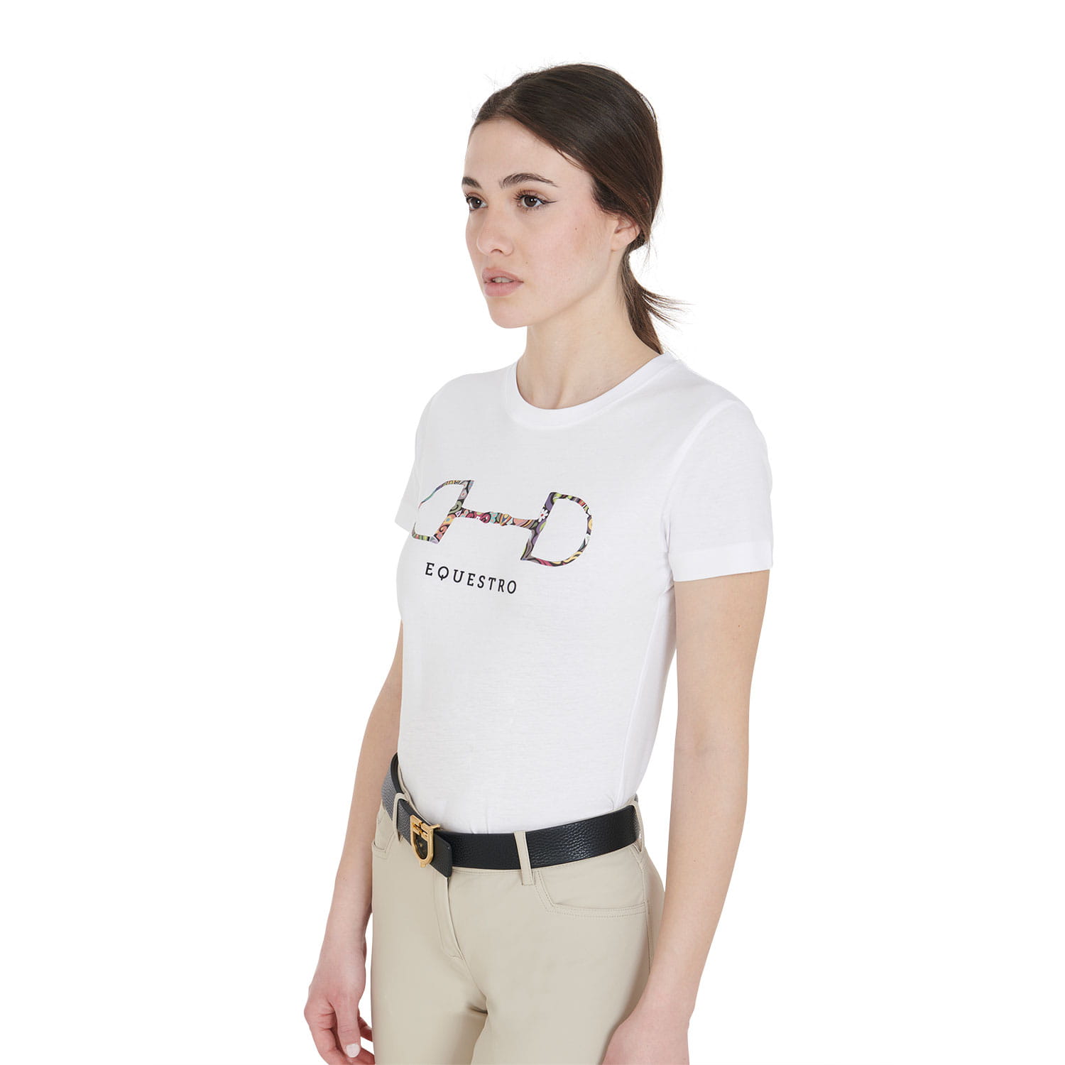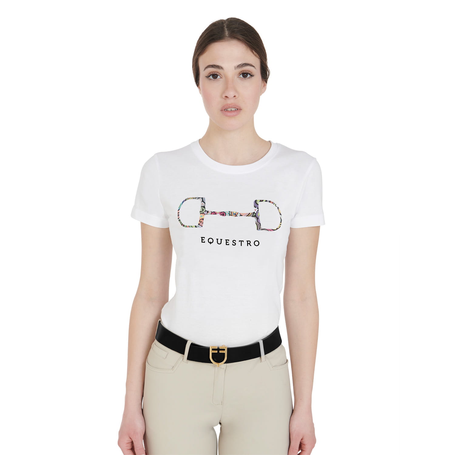 Bawełniana koszulka damska slim fit z krótkim rękawem, idealna na sezon letni, ponieważ jest oddychająca, elastyczna i świeża. Wydajna i praktyczna odzież, która gwarantuje całkowitą swobodę ruchów i maksymalny komfort. T-shirt ozdobiony jest nadrukiem kolorowego konturu wędzidła.