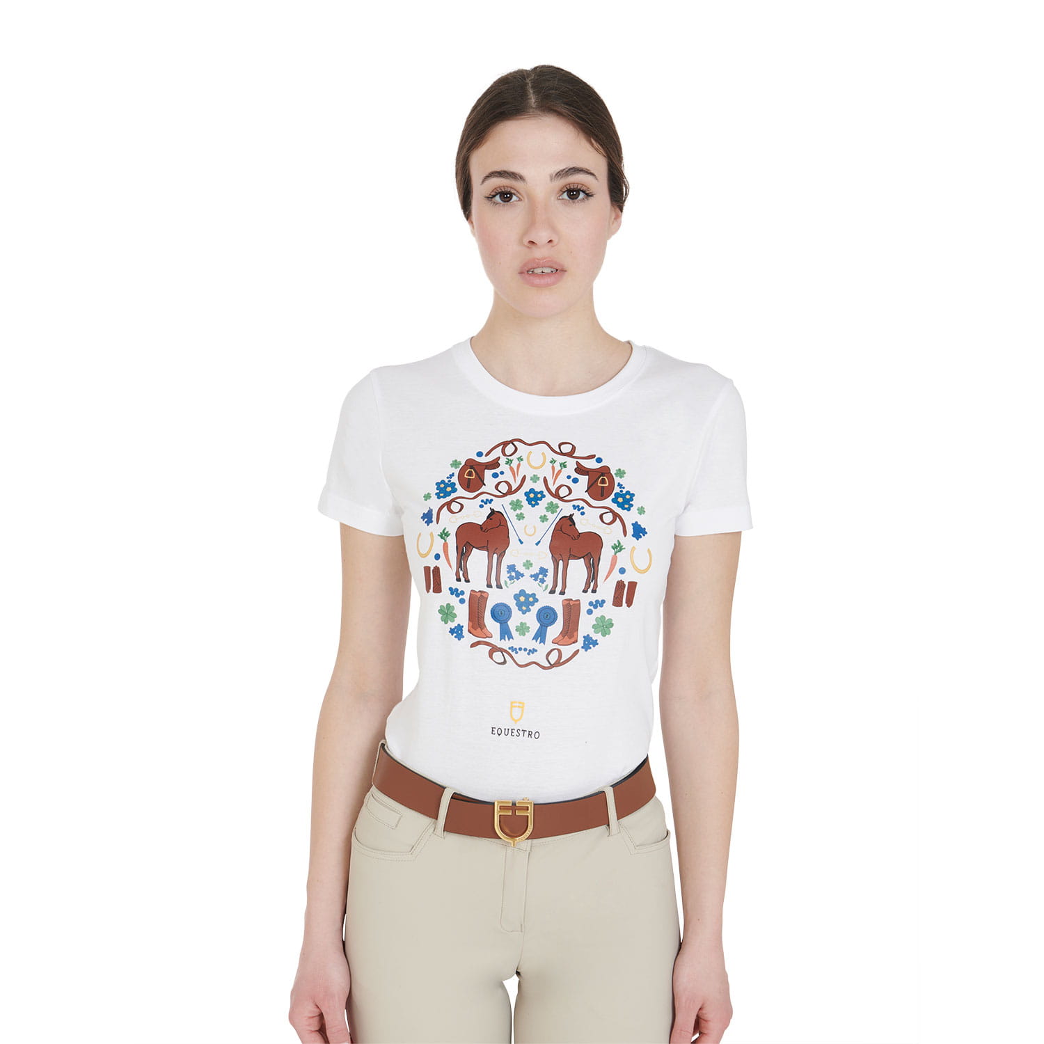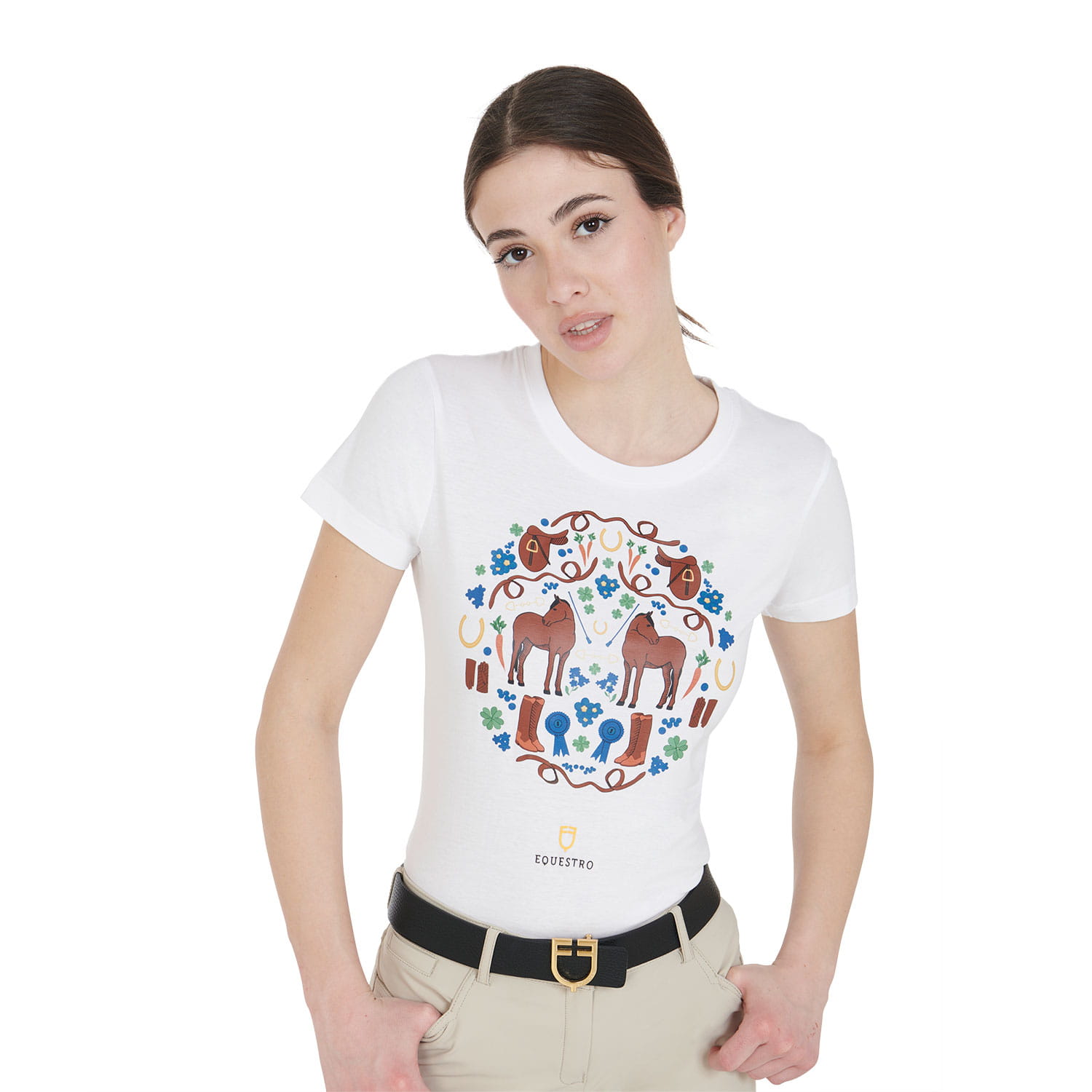 Bawełniany t-shirt damski o dopasowanym kroju z krótkim rękawem, idealny zarówno na codzienny trening, jak i w czasie wolnym. Doskonała odzież na sezon letni, ponieważ jest oddychająca, elastyczna i świeża. Gwarantuje doskonałe dopasowanie i wyjątkowy komfort. T-shirt ozdobiony jest nadrukiem kolorowych sylwetek koni, siodeł i butów.