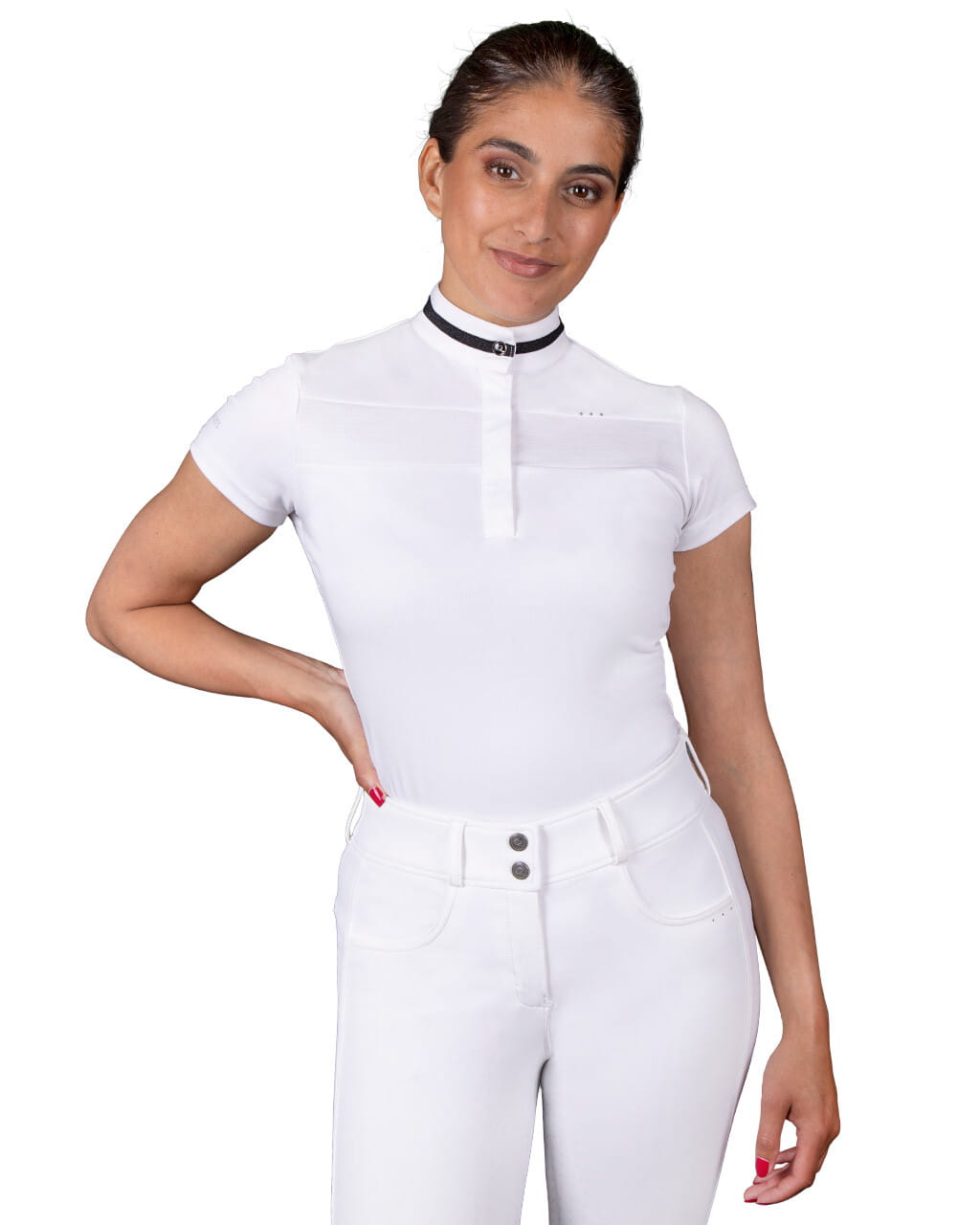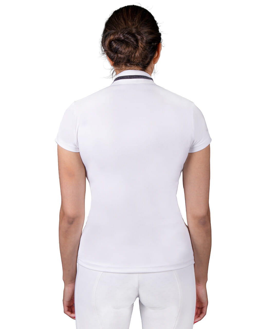 Stylowa i funkcjonalna koszulka konkursowa QHP „Kae” w kolorze białym to doskonały wybór dla amazonek ceniących elegancję i wygodę. Wykonana z oddychającej, elastycznej tkaniny, która skutecznie odprowadza wilgoć, zapewnia pełen komfort podczas startów w zawodach. Model wyróżnia się krótkim rękawem, idealnym na cieplejsze dni, oraz ozdobnym kołnierzykiem wykończonym brokatową taśmą i metalową szpilką Q-pin, która dodaje blasku i stylu.