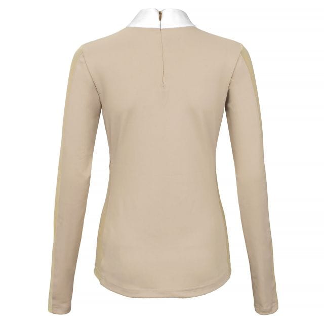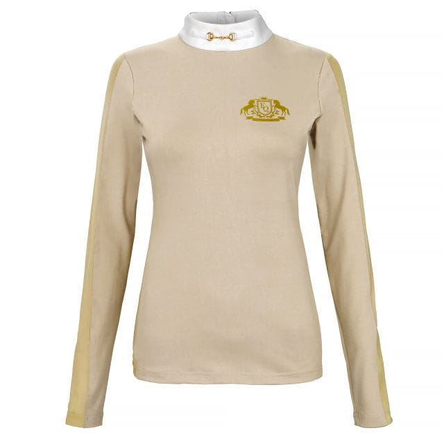 Klasyczna koszulka konkursowa z długim rękawem. Uszyta z materiału technicznego. Zdobiona metalowym wędzidłem w karczku, siateczką wzdłuż rękawów oraz delikatnym printem. Zapinana na zamek na plecach.