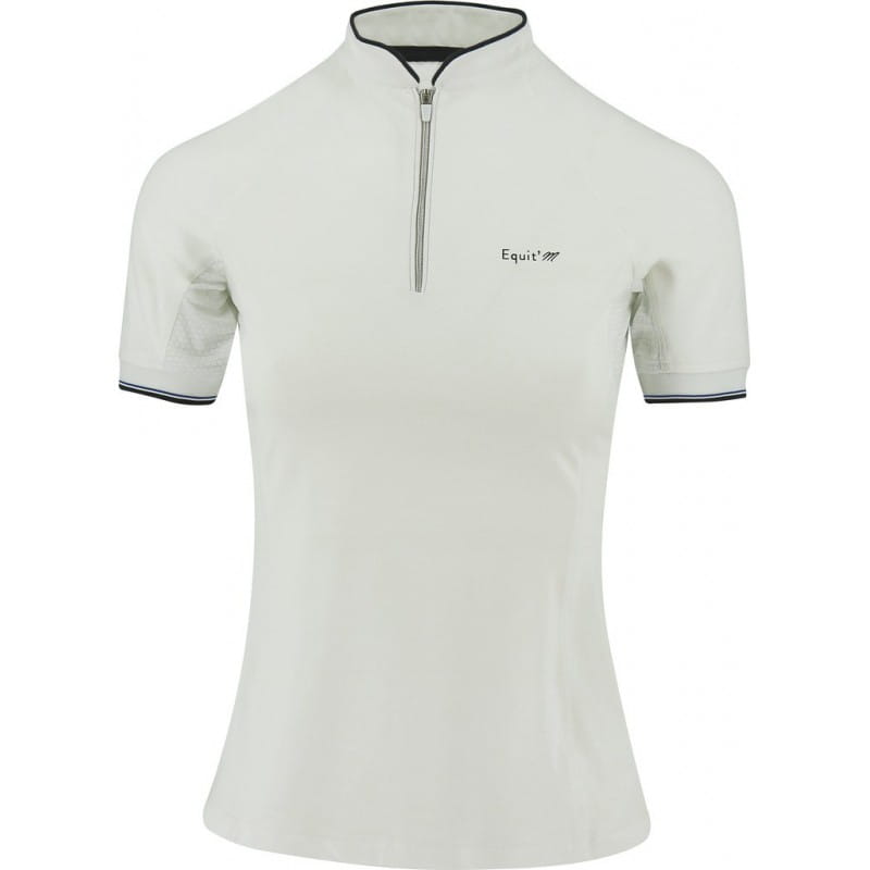 Koszulka konkursowa firmy Equi Theme. Wykonana z wysokiej jakości materiału technicznego. Oddychająca, przyjemna dla skóry. Posiada wstawki z siatki pod pachami dla lepszej cyrkulacji powietrza. Zapinana na suwaczek przy kołnierzyku. Taliowana, dobrze dopasowuje się do ciała.