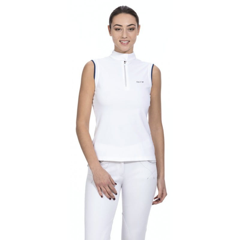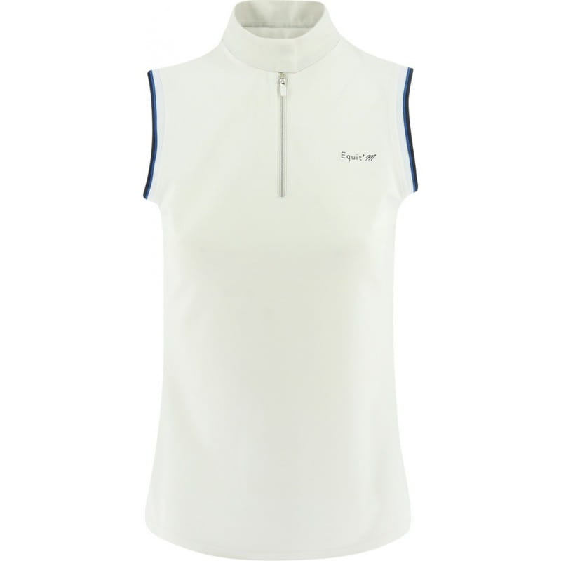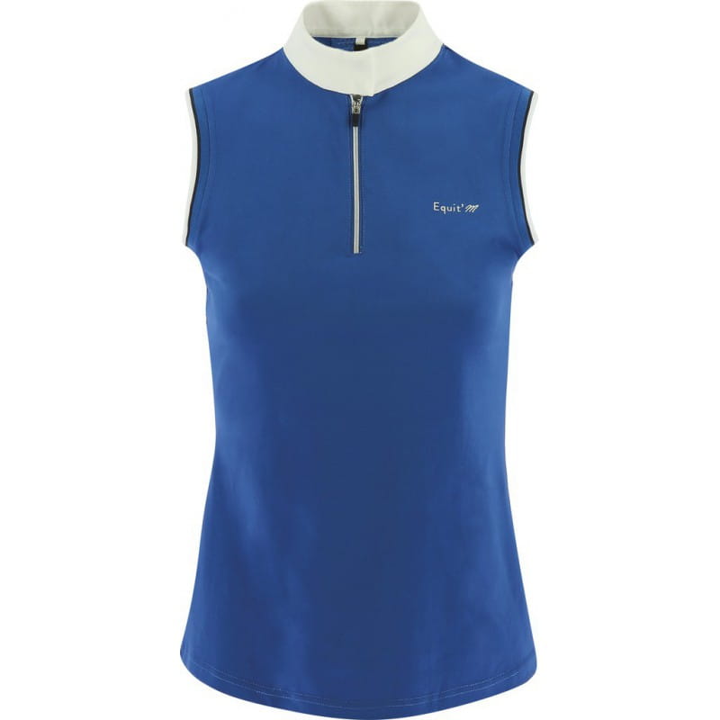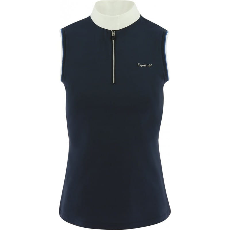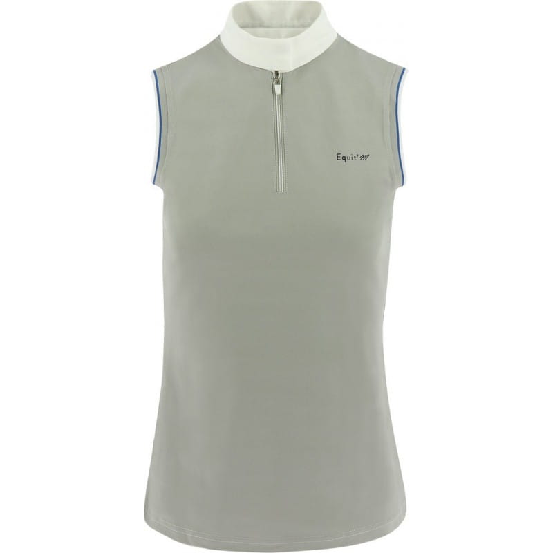 Koszulka konkursowa firmy Equi Theme. Wykonana z wysokiej jakości materiału technicznego. Oddychająca, przyjemna dla skóry. Posiada wstawkę z siatki na plecach dla lepszej cyrkulacji powietrza. Zapinana na suwaczek przy kołnierzyku. Taliowana, dobrze dopasowuje się do ciała.