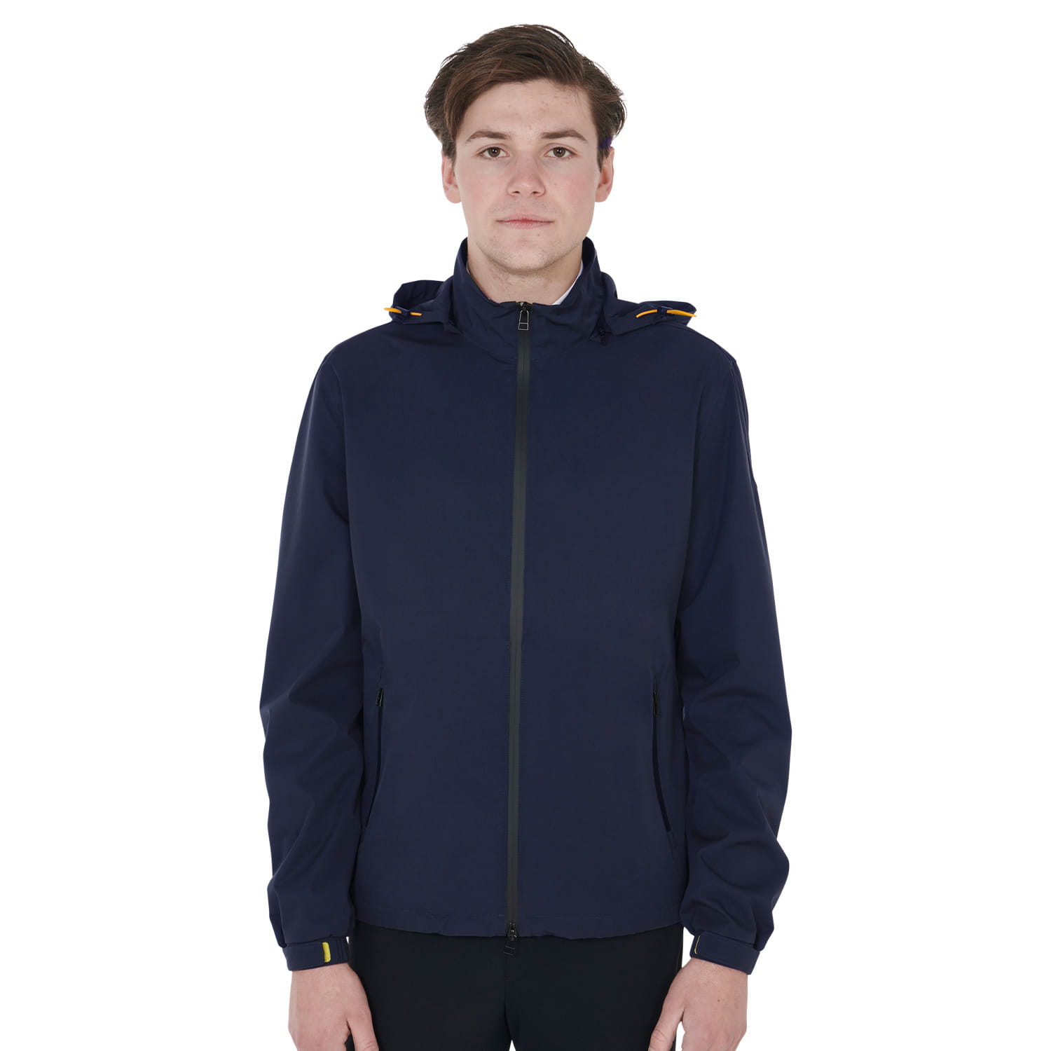 Męski płaszcz przeciwdeszczowy wykonany z technicznego materiału z 3 warstwami tkaniny z oddychającą i wodoodporną membraną. Gwarancja maksymalnej ochrony przed wodą i dużej swobody ruchów.