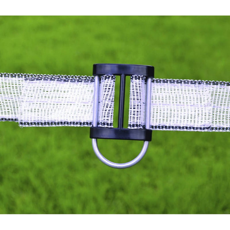 Okucia do taśm są łatwe w użyciu. Ten łącznik jest odpowiedni dla wszystkich standardowych taśm ogrodzeniowych. Solidny łącznik do taśmy wykonany z jednego kawałka metalu i nietłukącego tworzywa sztucznego. Rozmiar: 40 mm.