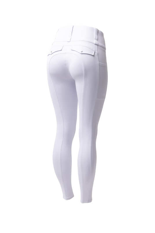 Białe legginsy damskie jeździeckie z pełnym lejem silikonowym Anya Horze to idealny wybór dla amazonek poszukujących połączenia sportowej funkcjonalności z eleganckim, zawodniczym stylem. Jasny kolor sprawia, że model doskonale sprawdzi się podczas zawodów jeździeckich oraz oficjalnych treningów.