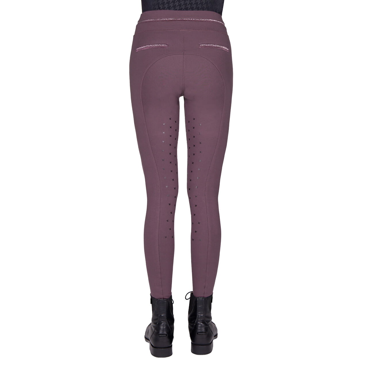 Sportowe legginsy jeździeckie Fayen to doskonały wybór na chłodniejsze dni, zapewniając ciepło i komfort dzięki szczotkowanej wewnętrznej stronie. Wykonane z grubego, elastycznego materiału, składającego się w 95% z poliestru i 5% z elastanu, gwarantują pełną swobodę ruchu i trwałość. Średnia talia z elastycznym pasem, ozdobionym srebrną i fioletową brokatową lamówką, dodaje elegancji i stylu. Legginsy posiadają wsuwane kieszenie na obu udach, idealne do przechowywania telefonu. Średnie, pełne siedzisko z ozdobnym wzorem zapewnia dobrą przyczepność na siodle, co czyni je praktycznym wyborem dla każdej amazonki. Te legginsy są częścią kolekcji Fayen, łącząc funkcjonalność z nowoczesnym designem.