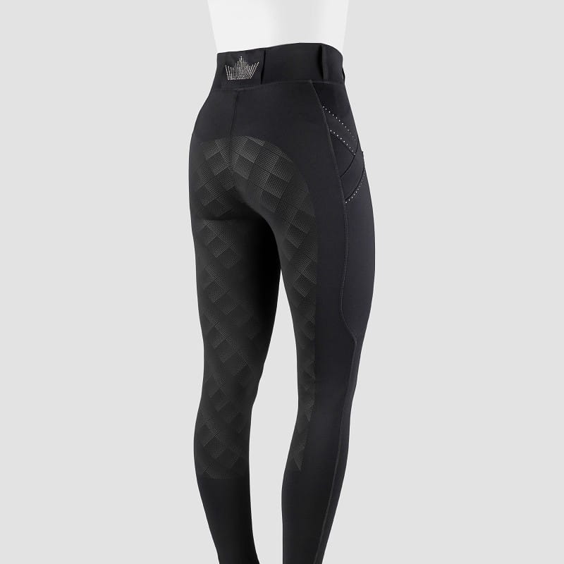 Legginsy jeździeckie Horka Momentum w kolorze czarnym to wyjątkowa propozycja dla jeźdźców, którzy cenią sobie zarówno funkcjonalność, jak i elegancję. Wykonane z wysokiej jakości dzianiny (90% poliester, 10% spandex), charakteryzują się dużą odpornością na ścieranie oraz doskonałym dopasowaniem. Fantazyjny design wzbogacony kryształową lamówką wokół bocznych kieszeni na telefon, na lewym udzie oraz z tyłu pasa, dodaje szyku i podkreśla wyjątkowy charakter produktu. Matowe silikonowe pełne siedzisko w kropki zapewnia stabilność w siodle, a boczna kieszeń z zamkiem błyskawicznym oferuje praktyczność. Model Momentum łączy sportowy styl z nutą wyrafinowanej elegancji.