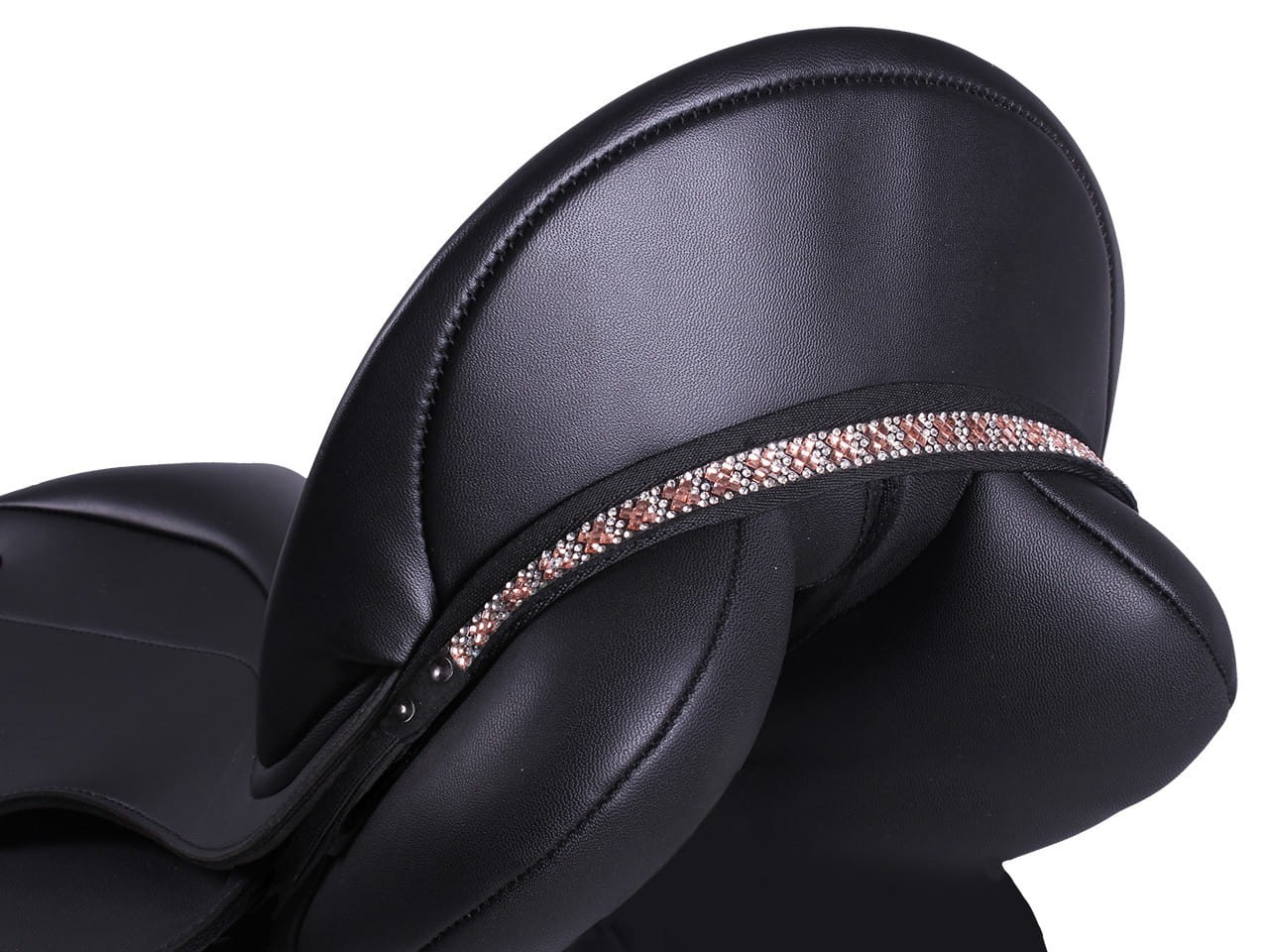 Elegancka nakładka na tylny łęk QHP "Macey" to doskonały sposób, aby dodać siodłu wyjątkowego charakteru. Wykonana z elastycznego materiału, dzięki czemu łatwo dopasowuje się do większości siodeł. Ozdobiona błyszczącymi detalami, które pięknie prezentują się w słońcu i podkreślają styl jeźdźca. Posiada regulowaną długość oraz łatwe mocowanie, co gwarantuje stabilność i wygodę użytkowania.