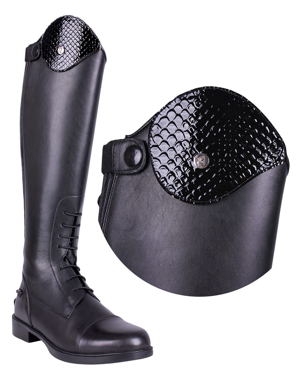 Stylowe nakładki do oficerek QHP Romy w klasycznym, czarnym kolorze. Wykonane z lakierowanej skóry o wzorze skóry krokodyla, dzięki czemu nadają oficerką elegancki i wyjątkowy wygląd. Mocowane na rzepy, co umożliwia szybkie dopasowanie i wymianę. Doskonały sposób na spersonalizowanie obuwia jeździeckiego.