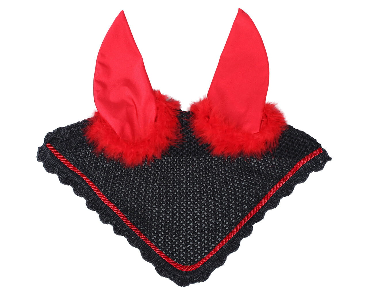 Dzianinowe nauszniki QHP z motywem „Devil” to oryginalne i stylowe akcesoria jeździeckie, idealne na Halloween. Wykonane w 100% z poliestru, z elastycznymi uszami zapewniają komfort noszenia i dopasowanie do głowy konia.