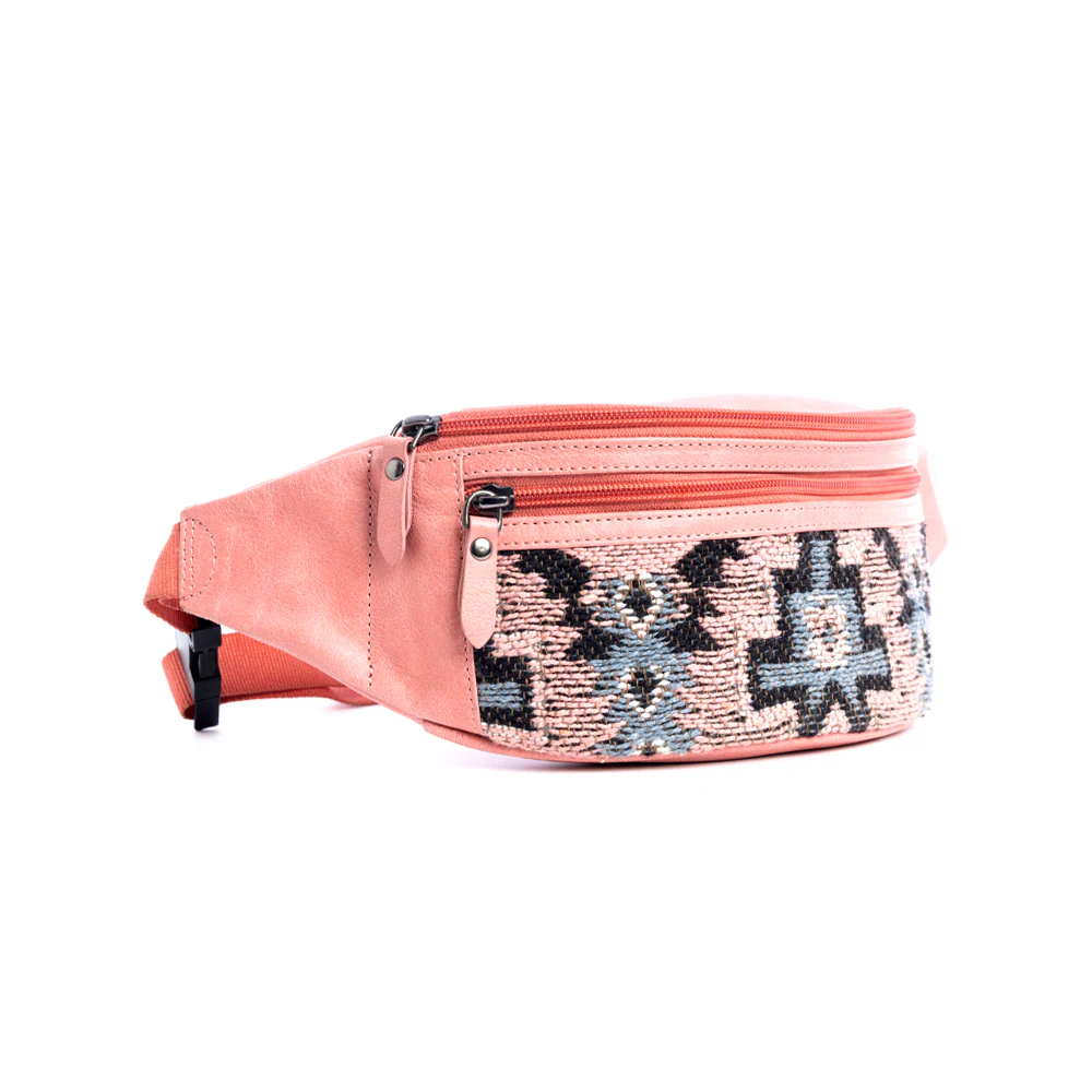 Ta wyjątkowa saszetka typu nerka marki Myra to połączenie westernowego charakteru, funkcjonalności i rzemieślniczego stylu. Model wyróżnia się intensywną, różową kolorystyką oraz geometrycznym wzorem inspirowanym estetyką Southwest, wykonanym z tkanej tkaniny z odzysku. Skórzane elementy z naturalnej skóry nadają całości trwałości i eleganckiego wykończenia.