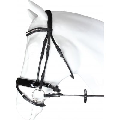 Piękne ogłowie rurkowe firmy Horka. Szeroki lakierowany nachrapnik i naczólek ozdobiny diamentami.