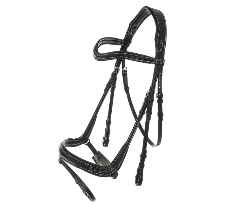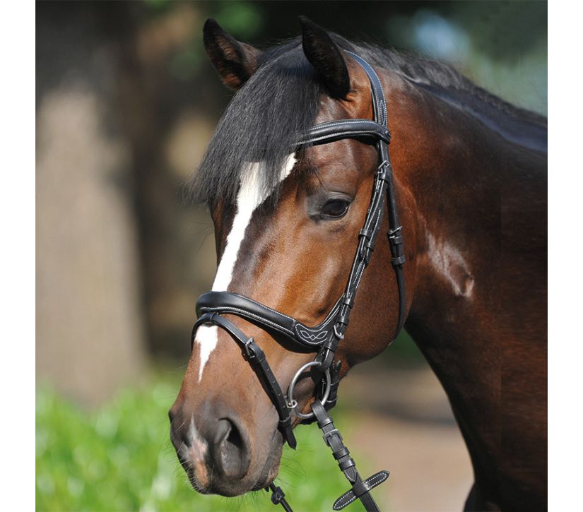 - nachrapnik angielski ze skośnikiem pasek potyliczny i nachrapnik miękko podszyte - Kontrastowe przeszycia - Nachrapnik profilowany, dobrze dopasowuje się do kształtu głowy konia - Szeroki, profilowany pasek potyliczny zapewnia swobodę dla uszu - Skórzany nagłówek w falę - W komplecie z ogumowanymi wodzami Rozmiary: pony, Cob, Full Kolor: czarny / czarne podszycie Okucia: srebrne
